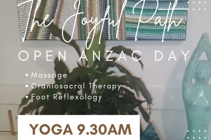 THE JOYFUL PATH O P E N as usual on ANZAC DAY. Yoga 9.30am. Also, available for Massage, Craniosacral Therapy and Reflexology.