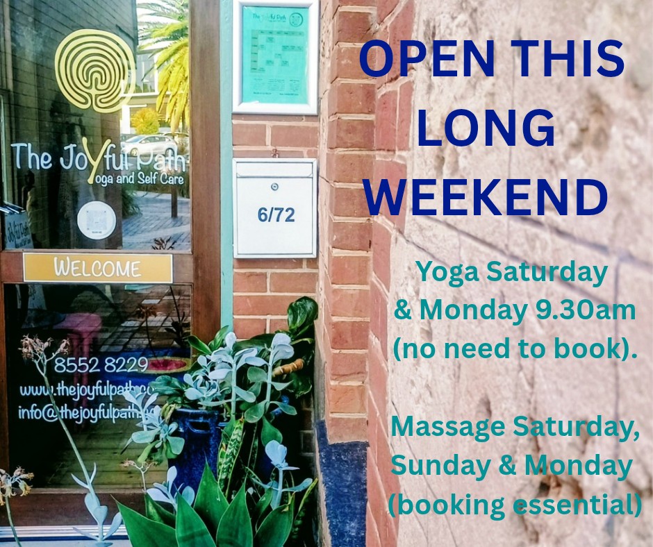 We’re open this Long Weekend for all treatments & yoga Sat+Mon