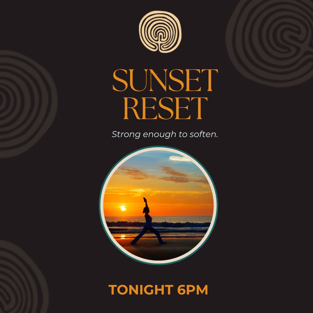 Sunset Reset begins with breath and stillness, builds into strong, grounding movement, and finishes with long holds and rest to help settle the nervous system before the night begins.